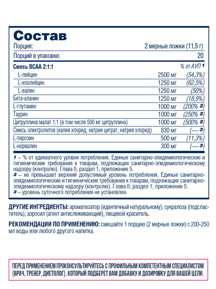 BCAA RXT Powder от Be First - это комплекс незаменимых аминокислот, формула которого специально расширена для более эффективного восстановления после тренировок. Входящие в состав лейцин, изолейцин и валин подавляют катаболизм и стимулируют рост мышц, глютамин дает питание мышечным клеткам и поддерживает иммунитет, который всегда страдает во время тренировок. Смесь электролитов восстанавливает баланс организма, обеспечивая регидратацию и оптимальную скорость обмена веществ. Цитруллин и норвалин улучшают кровообращение в мышцах, усиливают пампинг, повышают снабжение тканей кислородом и выведение вредных продуктов работы, например, лактата, повреждающего мышцы. А бета-аланин увеличивает концентрацию карнозина, препятствующего закислению мышц во время работы, уменьшающего степень повреждения мышечных волокон и стимулирующего восстановление.