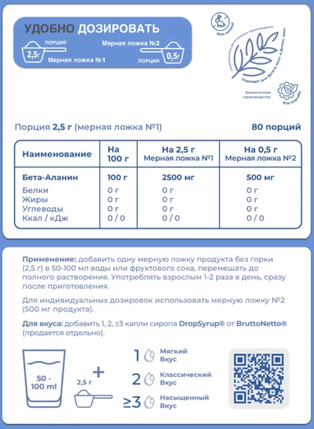 Размер одной порции : Рекомендуется разводить 1–2 мерные ложки (от 0,5 г до 2,5 г) в воде или соке. Употребляйте перед тренировкой для достижения максимального эффекта.