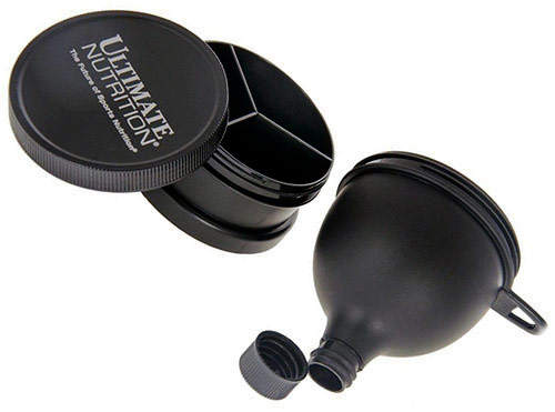 Уникальная воронка контейнер от компании Ultimate Nutrition состоит из двух прикручивающихся друг к другу отделений – контейнера для капсул, поделенного на 3 секции, и воронки для порошка с завинчивающимя отверстием. Воронку можно использовать для высыпания ВСАА, протеинов и изотоников в шейкер или бутылку. На воронке есть язычок для крепления к чему-либо. При желании контейнер для капсул или воронку можно использовать по-отдельности (на воронку надевается крышка от контейнера).