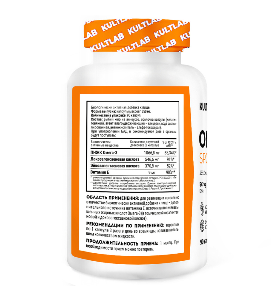 KultLab Omega-3 содержит самые ценные для человека ненасыщенные жирные кислоты: докозагексаеновую (ДГК) и эйкозапентаеновую (ЭПК). Они могут использоваться для профилактики широкого спектра заболеваний, борьбы с воспалениями и усиления работы мозга.