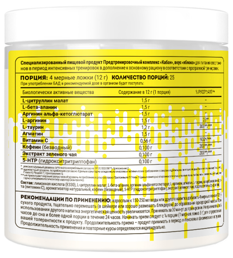 Рекомендации по применению: смешайте одну порцию (4 мерных ложки) с 150-250 мл воды. Начинать прием следует с ½ порции для определения вашей толерантности к продукту. Принимайте одну порцию за 30 минут до тренировки. Не принимайте за 6 часов до сна и более одной порции в течении 24 часов.