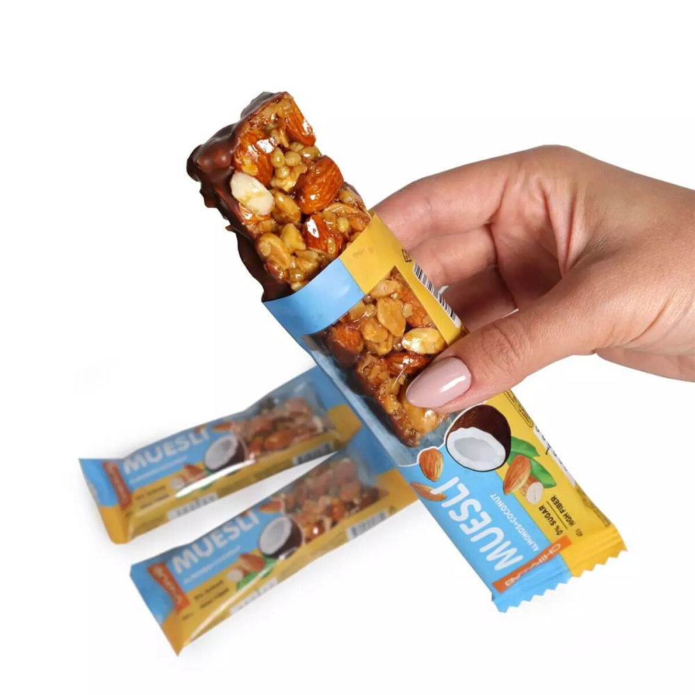 миндаль, кокос, молочный шоколад (водорастворимые волокна кукурузы, какао-масло, какао тёртое, молоко сухое обезжиренное, эмульгатор (соевый лецитин), ароматизаторы натуральные, подсластитель (сукралоза)), олигофруктоза (пищевые волокна), арахис, инулин(пищевые волокна), вода, кокосовое масло, рисовые шарики (рисовая мука, кукурузная крупа, соль), агент влагоудерживающий (глицерин), соль морская, ароматизаторы натуральные, эмульгатор (соевый лецитин), антиокислитель (аскорбиновая кислота), консервант (сорбат калия), натуральный подсластитель (стевиозид).