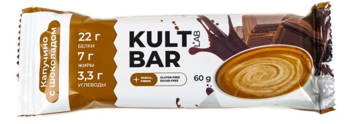 Kultlab Kult Diet — питательный фитнес-батончик, состоящий из высококачественного сывороточного протеина и натуральных ингредиентов: ягод, орехов и кусочков шоколада.