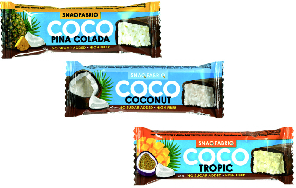 кокос, водорастворимые волокна кукурузы, инулин (пищевые волокна), олигофруктоза (пищевые волокна), молочный шоколад (водорастворимые волокна кукурузы, масло какао, какао тёртое, молоко сухое обезжиренное, эмульгатор (соевый лецитин), ароматизаторы  натуральные, подсластитель (сукралоза)), вода, агенты влагоудерживающие (глицерин, сорбит), соль, ароматизаторы натуральные, регулятор кислотности (лимонная кислота), антиокислитель (аскорбиновая кислота),  консервант (сорбат калия), натуральный подсластитель (стевия).