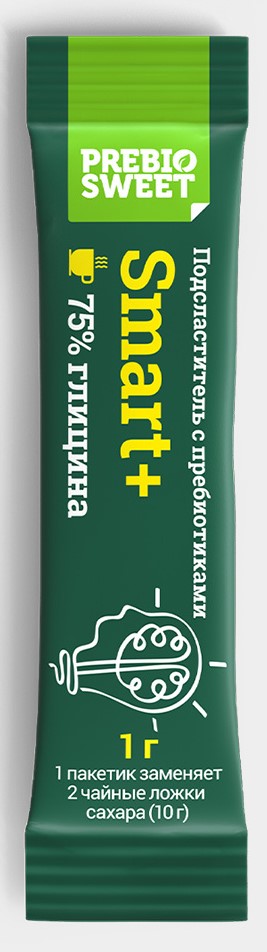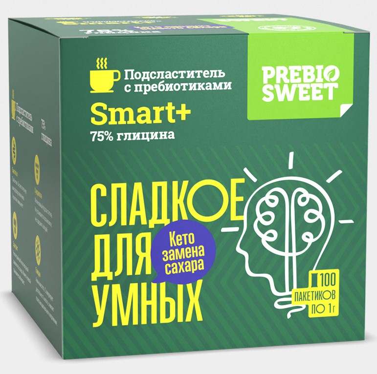 Заменяет 1 кг сахара. Сладкое для умных! Пребиосвит Смарт+ первый в России кето-сахарозаменитель. Содержит в большом количестве глицин – аминокислоту, которая способствует высокой работоспособности, нормализует работу мозга, улучшает качество сна. Пребиосвит Смарт+ в составе кетодиеты предохраняет мозг от преждевременного старения, обеспечивает профилактику дегенеративного заболевания центральной нервной системы. Полное отсутствие углеводов в составе Смарт+ делает его незаменимым сахарозаменителем при лечебном и косметическом голодании. Наличие же глицина, способствует легкому прохождению болезненного процесс похудения, защищает от стресса и предохраняет от «невроза отмены». Пребиосвит Смарт+ обладает чистым сахарным вкусом, но в отличие от сахара не увеличивает содержание глюкозы в крови. Именно этим своим качеством он необходим диабетикам и людям с высоким индексом тела.