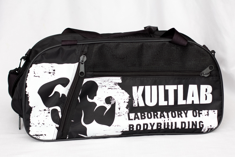 Фирменная спортивная сумка от KultLab с одним отделением, закрывается на молнию с двумя задвижками.
