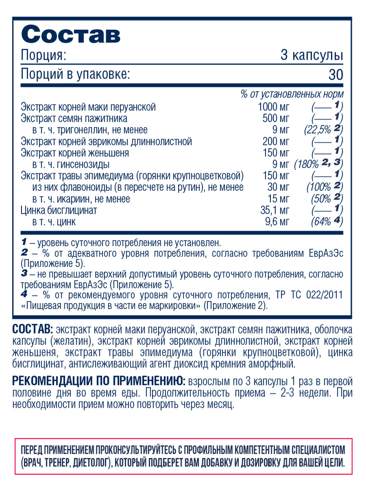 Из-за наличия в продукте адаптогенов с тонизирующим эффектом (эврикомы и женьшеня) начинайте прием с двух капсул натощак перед завтраком. В течение нескольких дней можно довести прием капсул до 3-4 за один прием. Физически активным мужчинам с весом более 90 кг оптимальной дозировкой может быть 5 капсул в день, которые следует разделить на 2 приема: 3 капсулы перед завтраком и 2 перед обедом.