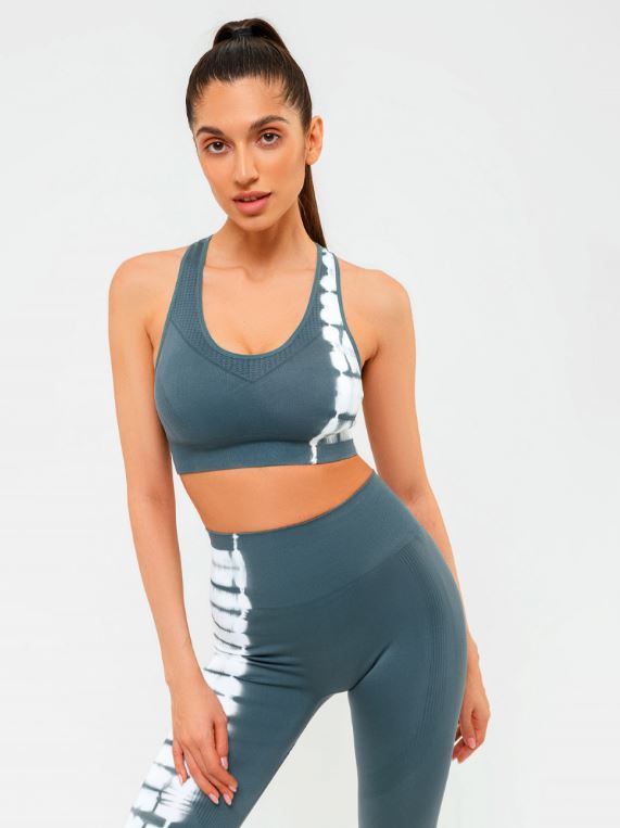 Бесшовное спортивное бра с уникальным «вареным» эффектом. Окрашивание в технике тай-дай выполнено с разных сторон бра и имеет уникальный рисунок. Бра средней степени поддержки, классическая форма с плавным глубоким вырезом и спиной-боксеркой.