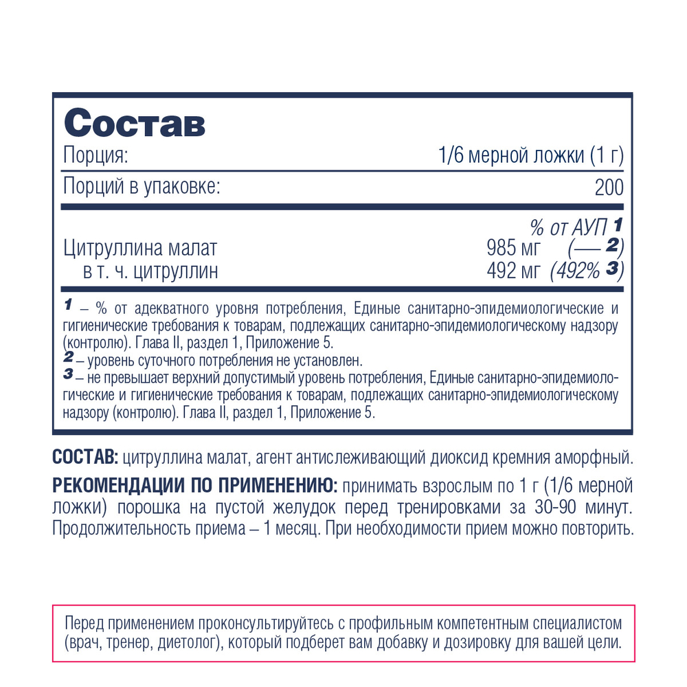 Всем, кто хочет добиться выраженного пампинга, повысить продуктивность тренировок, и улучшить питание мышц, а также тем, для кого важно быстрое восстановление — рекомендуется прием Citrulline Malate powder от Be First.