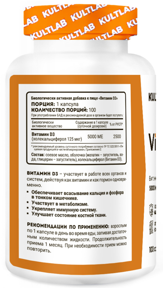 Витамин D3 от Kultlab - участвует в работе всех органов и систем, действуя как витамин и гормон одновременно.