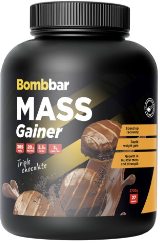 Гейнер на простых углеводах от BombBar, который содержит в себе комплексную белковую матрицу и креатин.